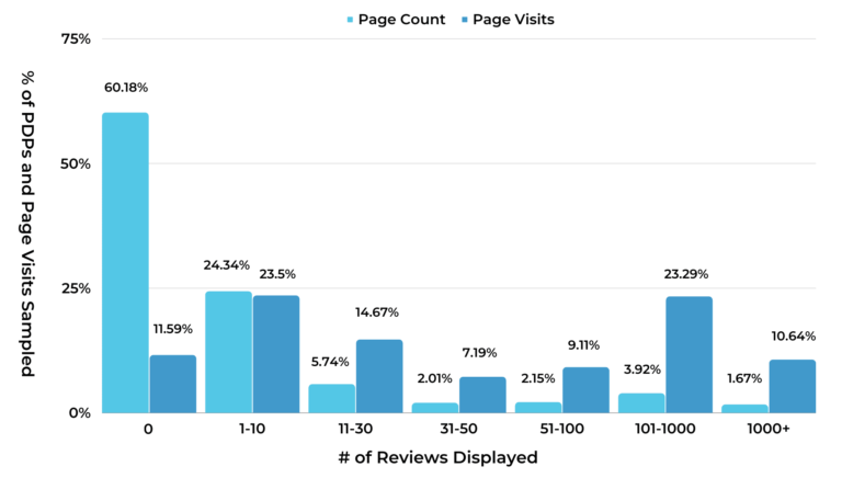 Across all the product pages we analyzed, the overwhelming majority (60.2%) don’t have any reviews. However, these PDPs only accounted for 11.6% of all page visits. This firstly demonstrates the huge opportunity for brands and retailers with review-less product pages.