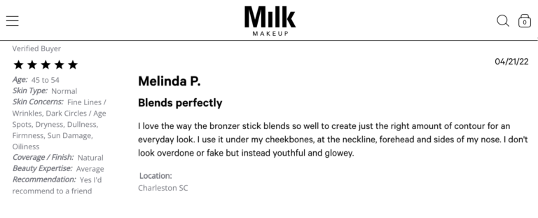 Ratings are the top consideration; three-quarters of beauty shoppers indicate they pay attention to a product’s average star rating. A customer’s opinion on specific extra details relevant to the product (aka the body of a review) are a close second, with 74% of beauty shoppers telling us this is something they pay attention to.