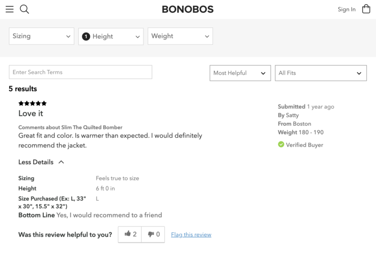 Reviews are not one size fits all. Your shoppers care most about the reviews that come from shoppers like them, who share their style, use case, and unique situation. That’s why it’s important to give shoppers the ability to filter for reviews from people like themselves. When demographic filters are available, 47% of consumers will use them to seek out information most directly relevant to them.