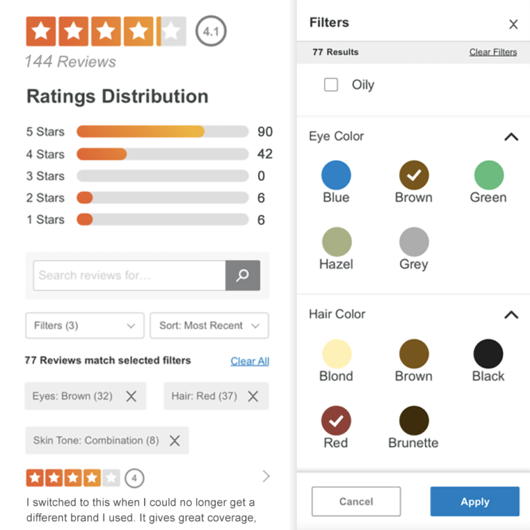 Even better, we’ve found adding demographic filters translates to more sales. Our clients see an average 52% increase in conversion when consumers interact with filter tags (e.g. sort reviews from users with a particular hair color).