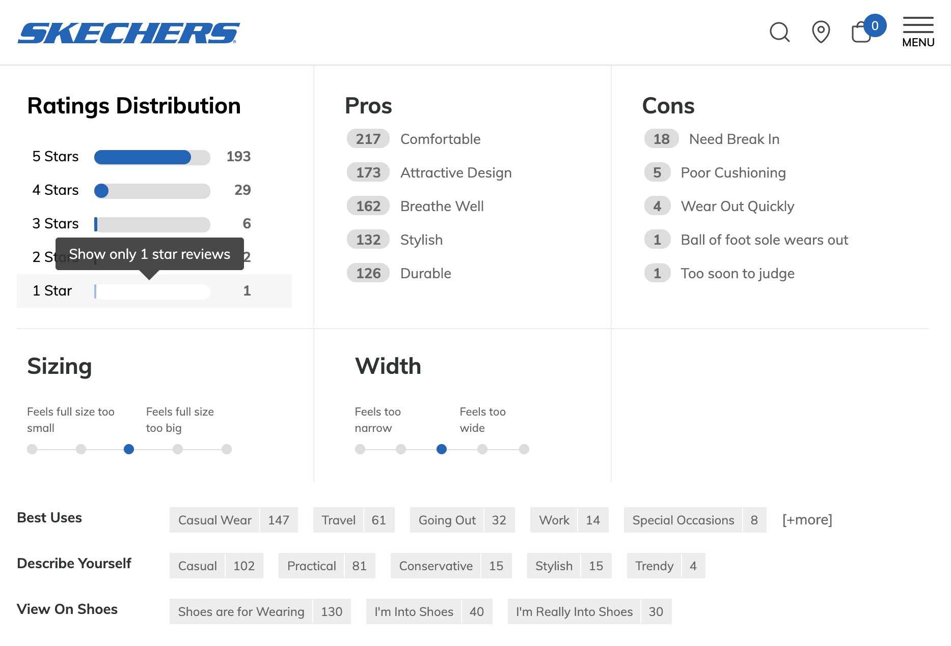 Of the shoppers who click on star ratings, 63% click on the 1-star option. Moreover, those shoppers are more than twice as likely to convert than shoppers that don’t click on anything (7.8% conversion for 1-star filter clickers vs 3.7% conversion for non-clickers).