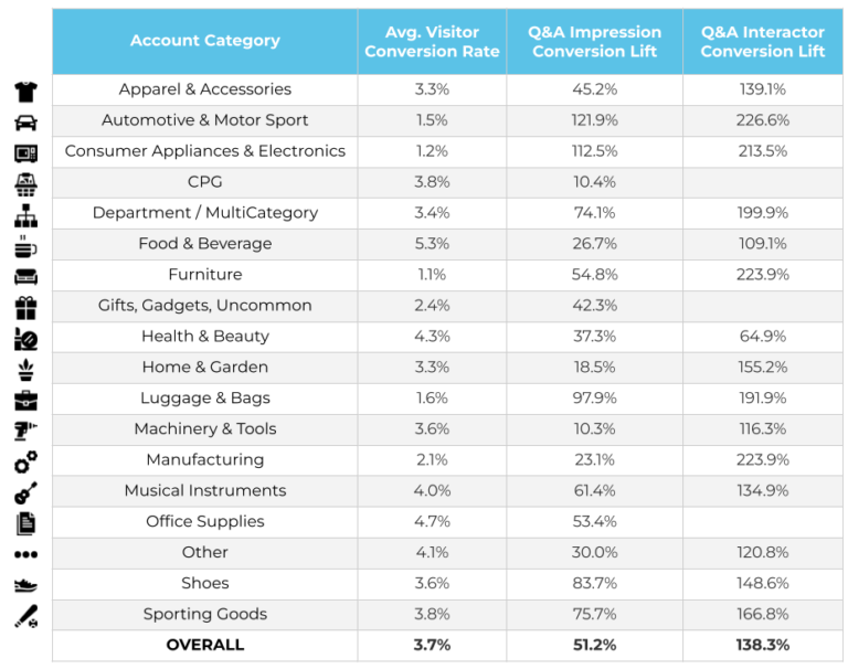 - Across verticals, the conversion lift for visitors who encountered Q&A content was 51.2%, showing that the mere presence of Q&A can positively impact conversion.
