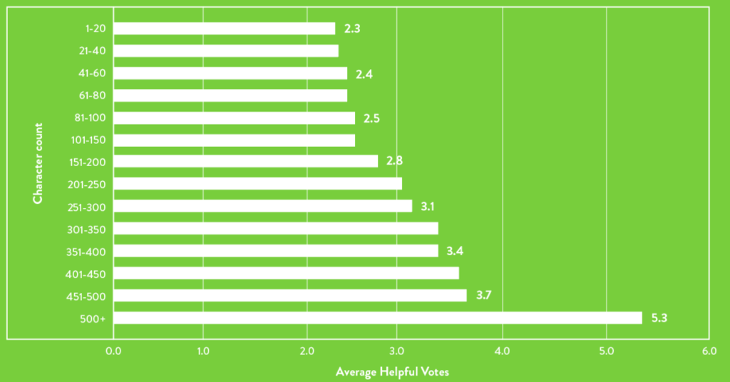 As you can see, helpfulness increases in line with review length growth. The trend is very clear. The longer the review, the more helpful it is. 500+ character reviews – in particular – evidently offer huge value to shoppers.