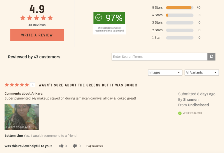 Over three-quarters (77%) of shoppers find filtering options useful when browsing review content. Include a filter for reviews that feature visual UGC.